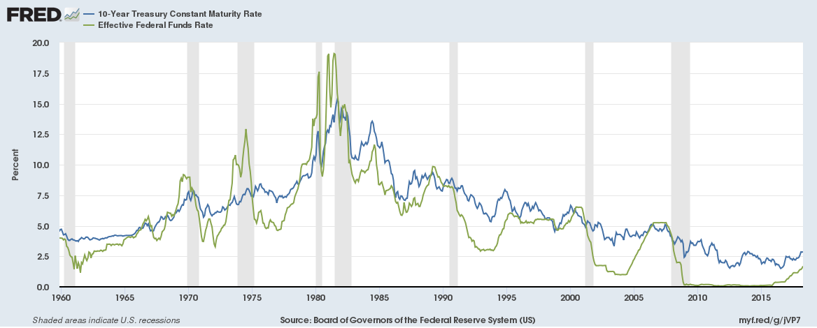 The graph shows the 10 twelvemonth authorities bond charge per unit of measurement as well as the overnight Federal Funds rate, which the Fed controls. Notice how an “inverted” spread — when the funds charge per unit of measurement is higher than the 10 twelvemonth charge per unit of measurement — is 1 of the most reliable indicators of a recession to come.